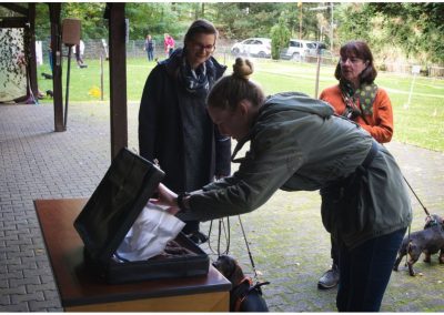 Der Papierkrieg, Chipkontrolle und Auslosung waren bald erledigt und alles in Ordnung und so standen als erstes 7 Hunde für die Schussfestigkeit auf dem Programm. 3 kamen nur der SFK wegen, 4 mussten die Schussfestigkeit als Voraussetzung zur Teilnahme an der anschließenden Spurlautprüfung erbringen.